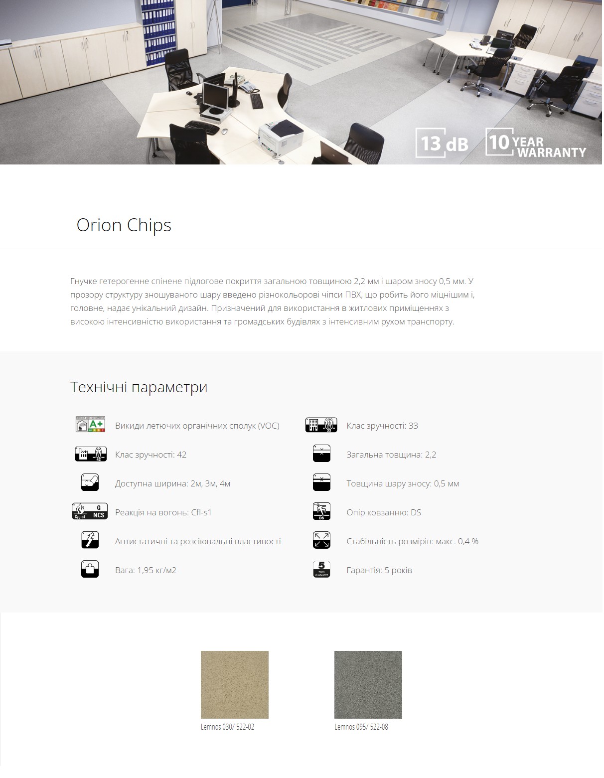 Напівкомерційний лінолеум Lentex Orion Chips завдяки практичному поєднанню високих зносостійких характеристик і прийнятній ціні знайде широке застосування в офісних та інших приміщеннях з підвищеною прохідністю. Легке мерехтіння кольорових "чіпсів" та чисті кольори фону створюють об'ємний дизайн підлоги, а правильне поєднання якості та ціни роблять цю колекцію універсальним рішенням. Спеціальний тильний шар покриття також підтримує основні властивості "офісної напівкомерції" - міцність та зносостійкість. Експерементуйте сміливо – такий лінолеум дозволяє створювати сучасні, стильні та зручні інтер'єри. Додатковий захисний шар захищає лінолеум від вологи, сонячного ультрафіолету, розчинників, бруду та плям і полегшує догляд за ним.